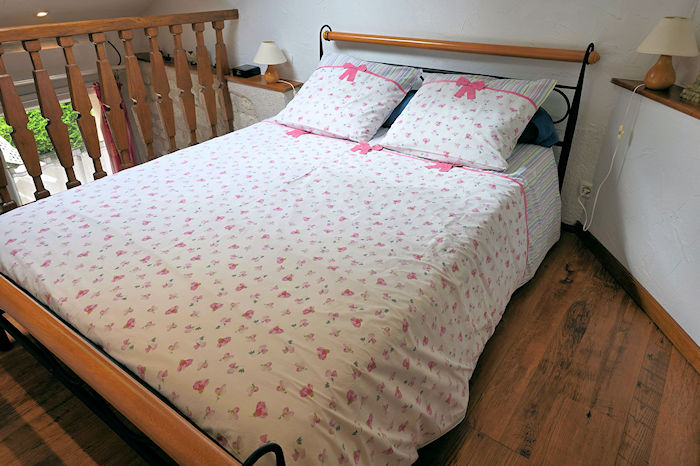 Située dans le corp principal de notre maison, la chambre de la ponette dispose d'un accès de plain pied à la terrasse et à la piscine. C'est une chambre en duplex avec un grand lit à l'étage et un lit simple en rez de jardin.