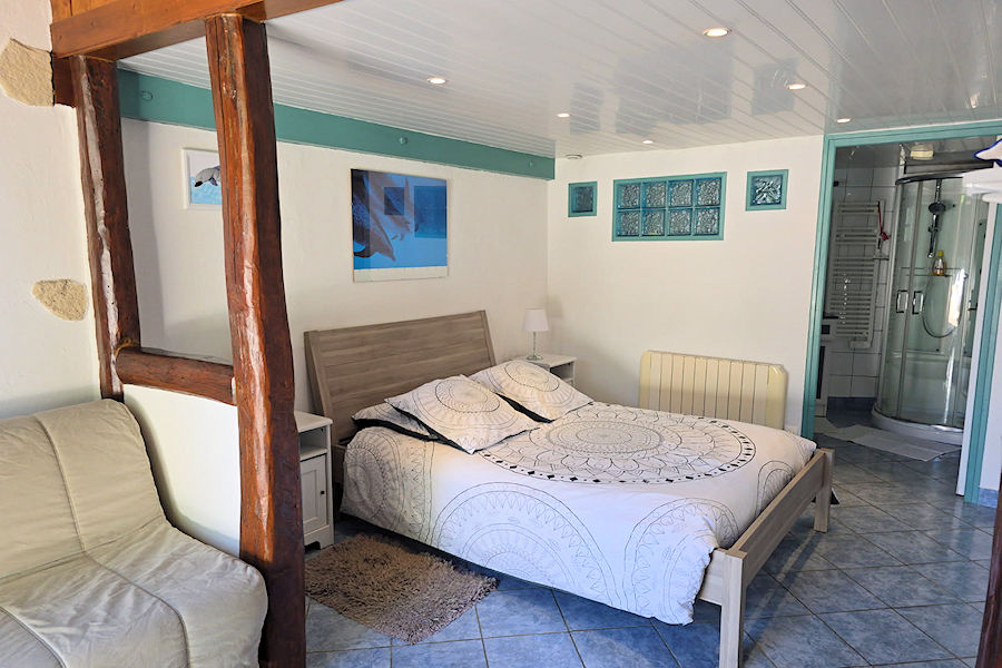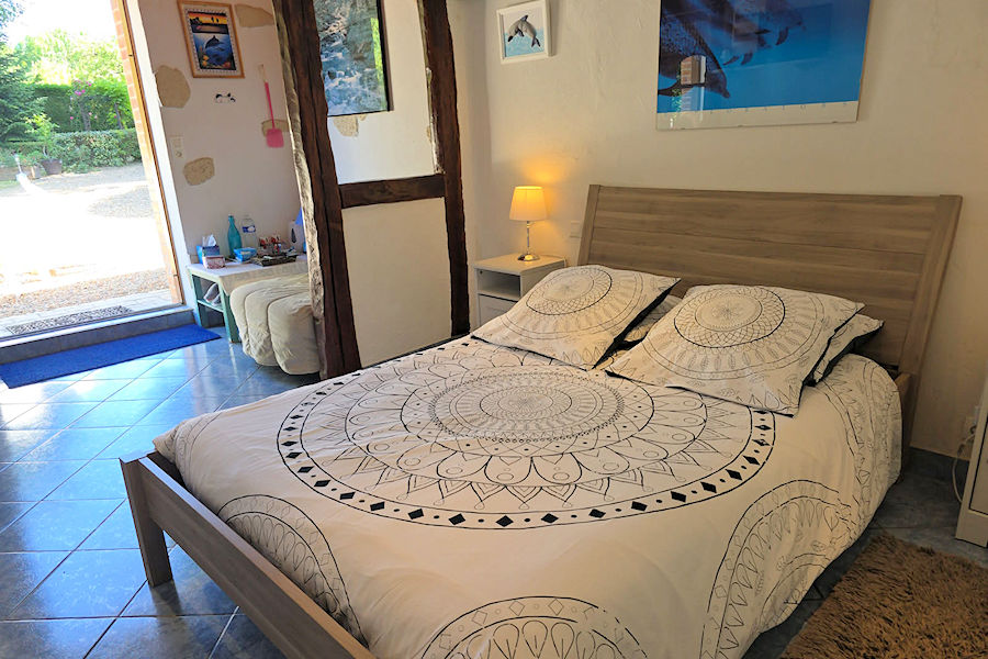 Située dans le corp principal de notre maison, la chambre des Dauphins dispose d'un accès de plain pied à la terrasse et à la piscine. Elle propose un grand lit et un lit simple au rez de chaussée.