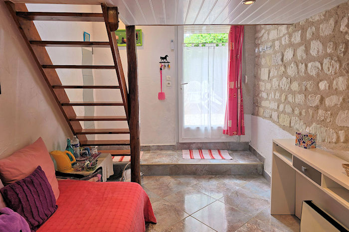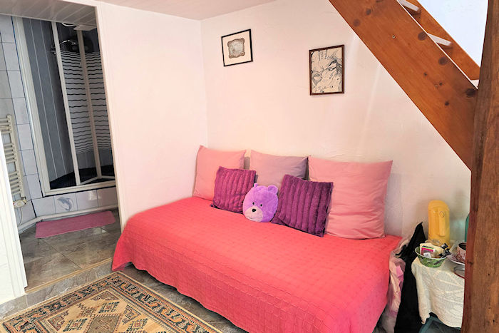 Située dans le corp principal de notre maison, la chambre de la ponette dispose d'un accès de plain pied à la terrasse et à la piscine. C'est une chambre en duplex avec un grand lit à l'étage et un lit simple en rez de jardin.